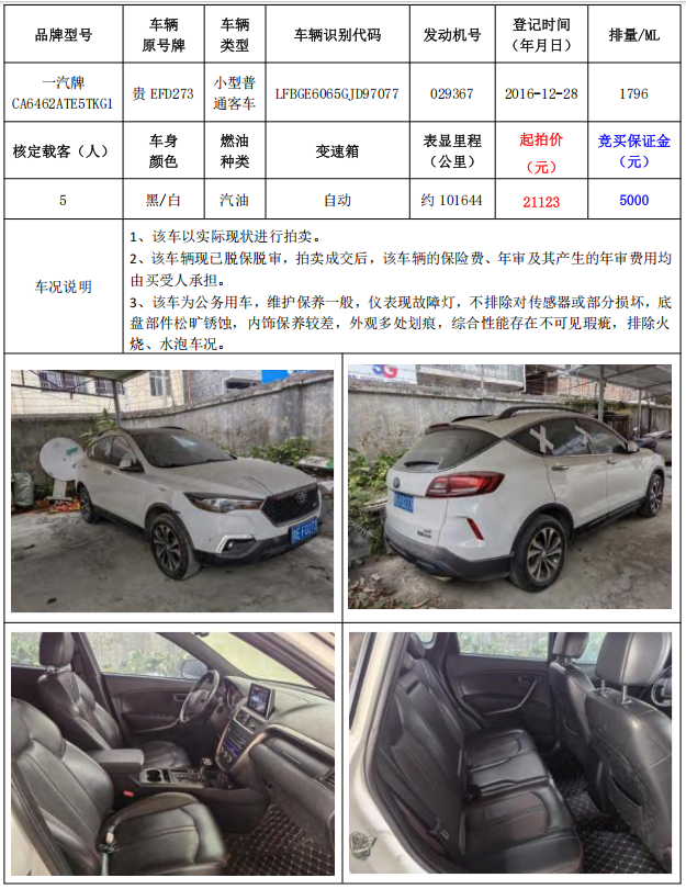 拍品編號1:一汽牌CA6462ATE5TKG1小型普通客車1輛