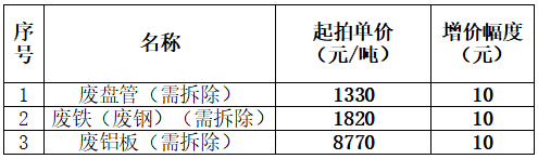該標(biāo)的為整體拍賣,以第1項廢盤管(需拆除)起拍單價1330元/噸進(jìn)行競價,采取增價方式競拍,每次每噸加價10元,上不封頂;廢盤管(需拆除)每增加10元/噸,第2、3項廢舊物資同步增加10元/噸。