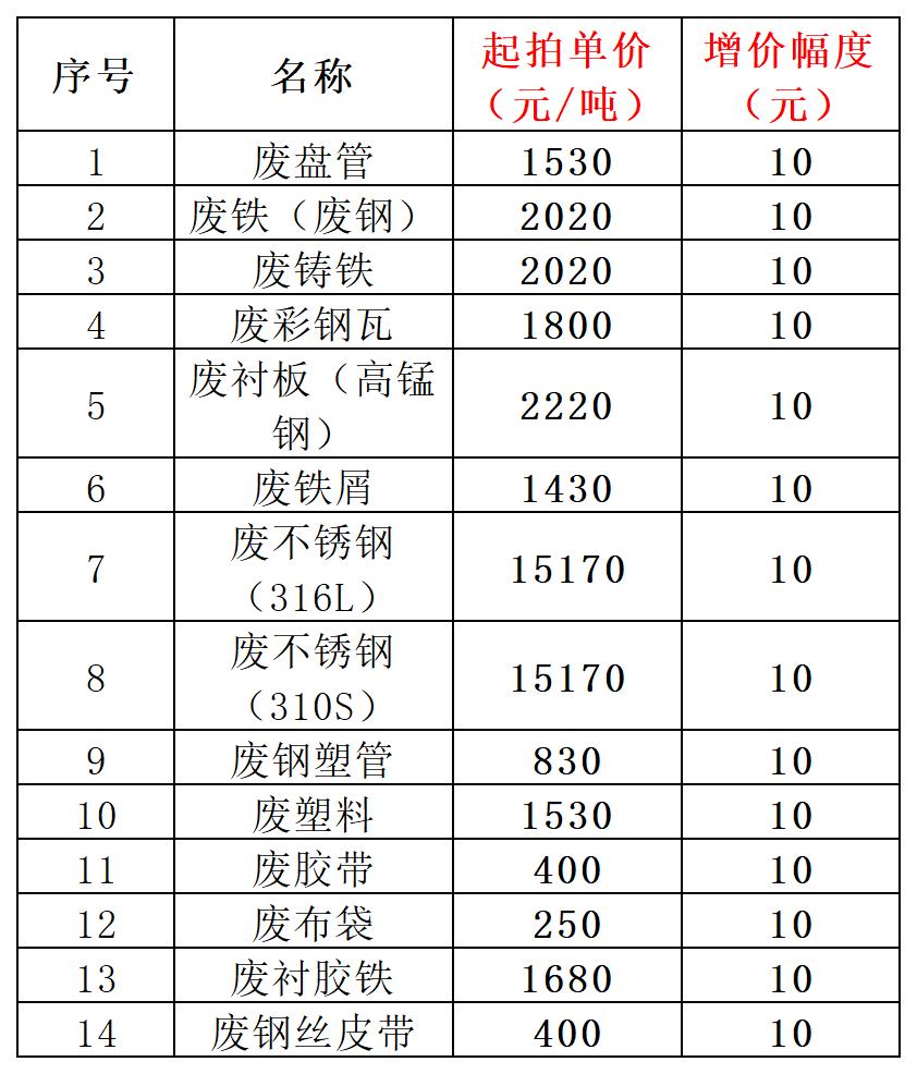 該標(biāo)的為整體拍賣,以第1項廢盤管起拍單價1530元/噸進(jìn)行競價,采取增價方式競拍,每次每噸加價10元,上不封頂;廢盤管每增加10元/噸,第2-14項廢舊物資同步增加10元/噸。