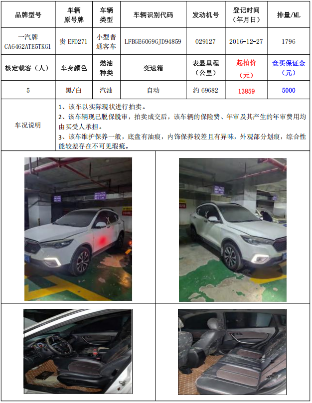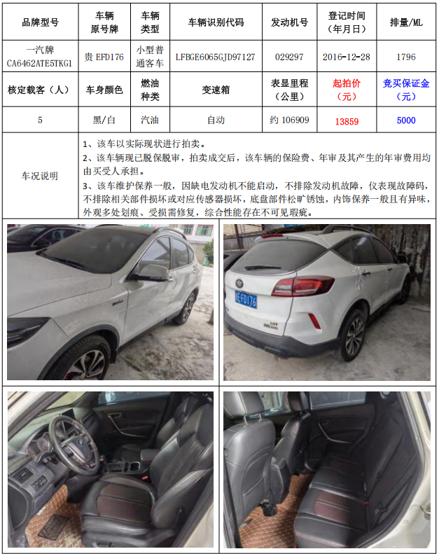 拍品編號(hào)1:一汽牌CA6462ATE5TKG1小型普通客車1輛(車輛原號(hào)牌:貴EFD271)