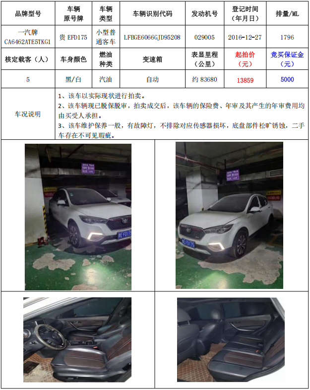拍品編號(hào)2:一汽牌CA6462ATE5TKG1小型普通客車1輛(車輛原號(hào)牌:貴EFD175)