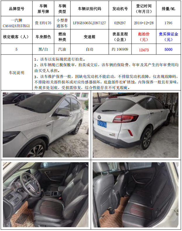 拍品編號(hào)1:一汽牌CA6462ATE5TKG1小型普通客車1輛(車輛原號(hào)牌:貴EFD271)