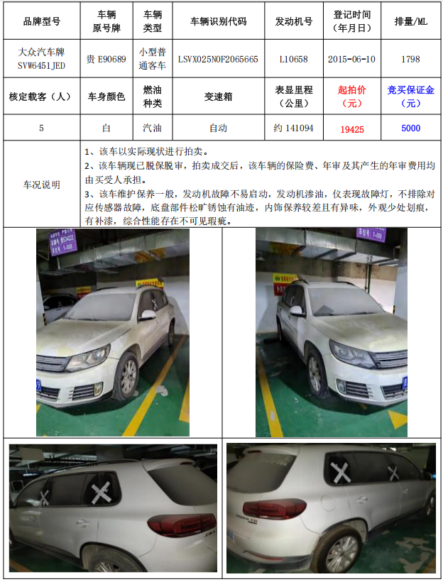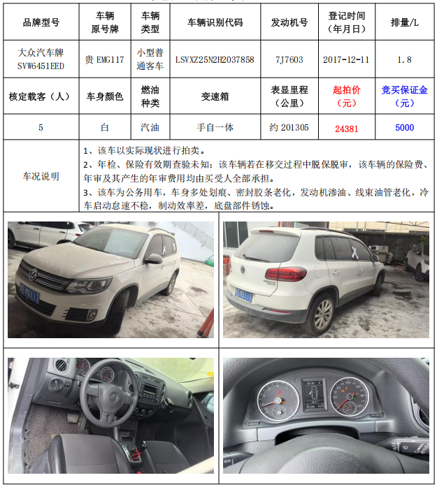 拍品編號(hào)7:大眾汽車牌SVW6451JED小型普通客車1輛(車輛原號(hào)牌:貴E90689)