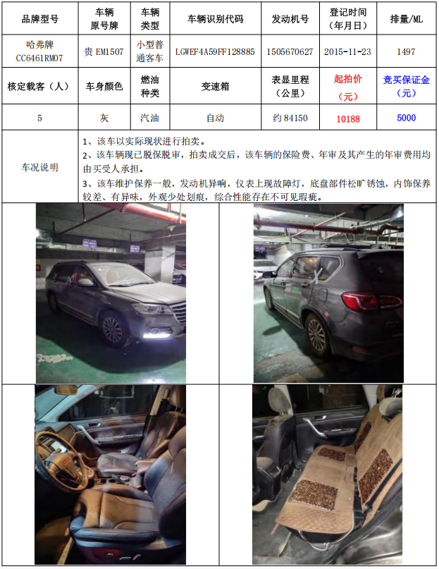 拍品編號(hào)6:哈弗牌CC6461RM07小型普通客車1輛(車輛原號(hào)牌:貴EM1507)