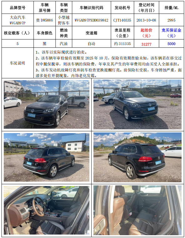1、大眾汽車WVGAB97P小型越野客車1輛,起拍價(jià):31277元,競買保證金:5000元。