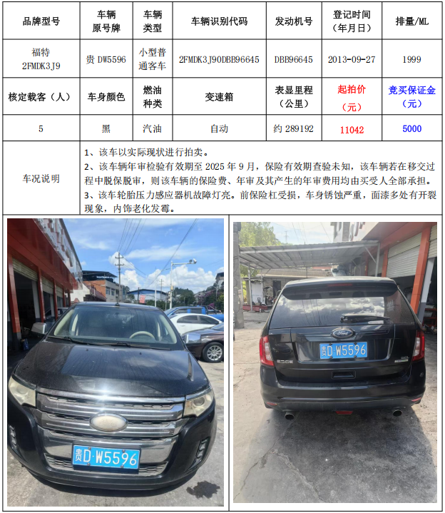2、福特2FMDK3J9小型普通客車1輛,起拍價(jià):11042元,競買保證金:5000元。