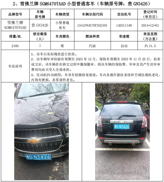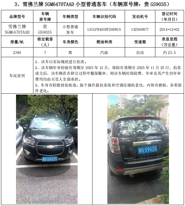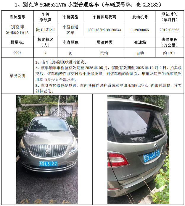 3、別克牌SGM6521ATA小型普通客車1輛、雪佛蘭牌SGM6470TAAD小型普通客車2輛,共計(jì)3輛,整體拍賣,起拍價(jià):28600元,競買保證金:5000元。