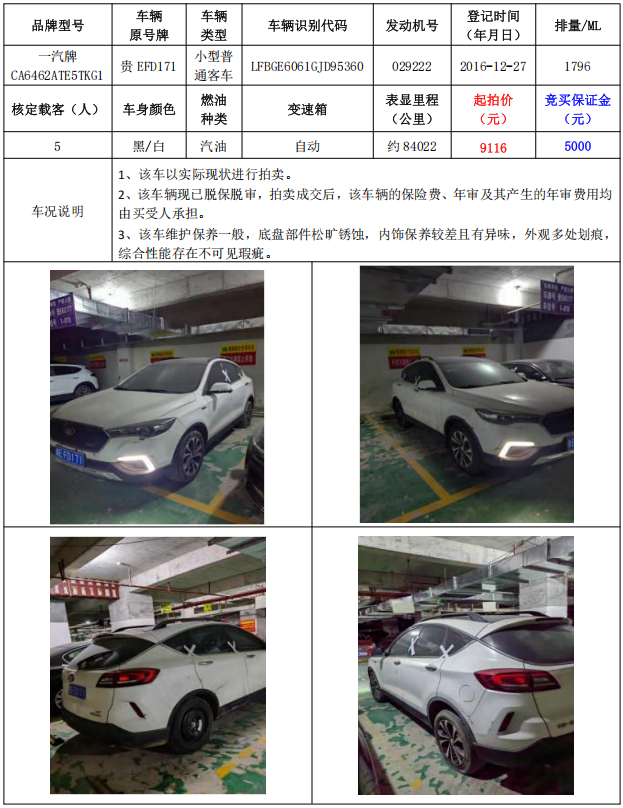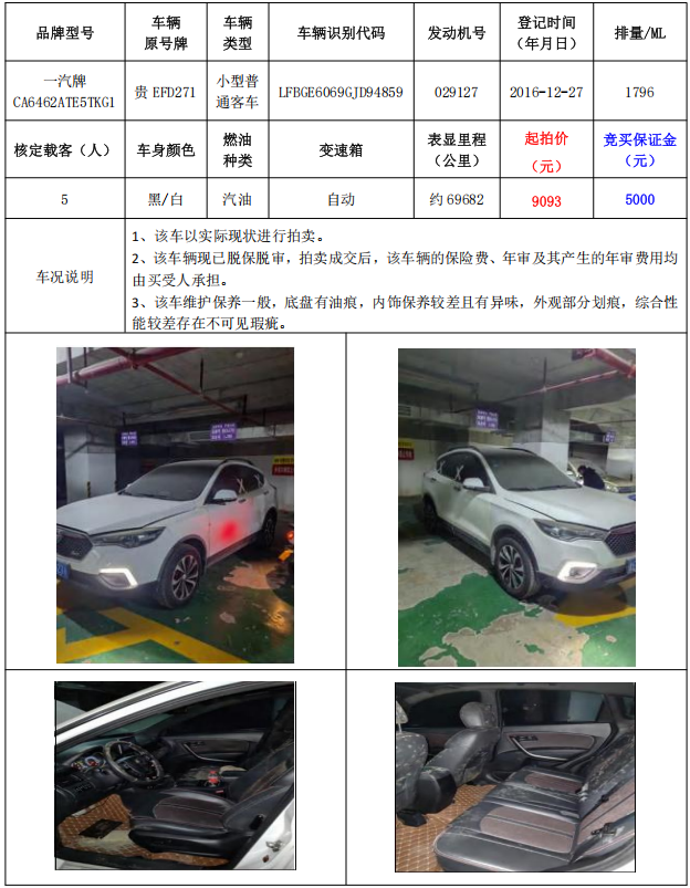 拍品編號(hào)1:一汽牌CA6462ATE5TKG1小型普通客車1輛(車輛原號(hào)牌:貴EFD271)