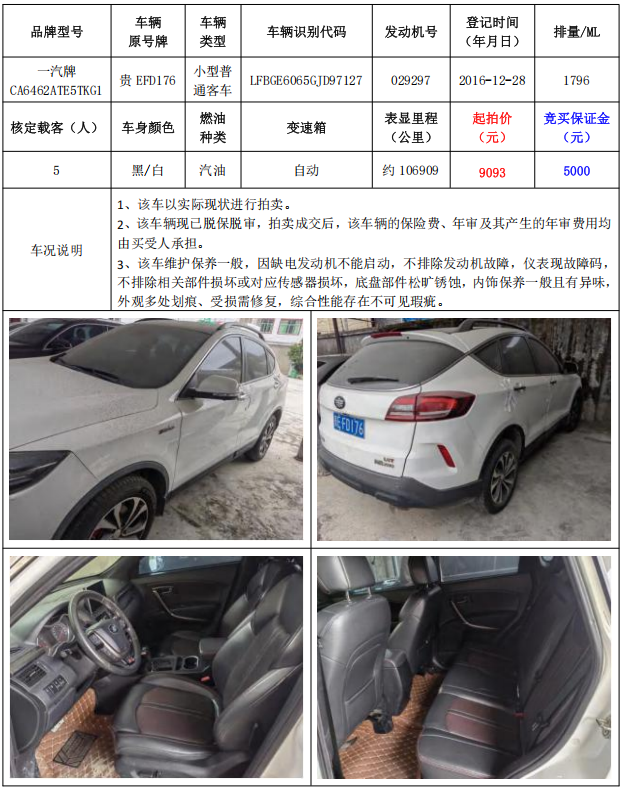 拍品編號(hào)2:一汽牌CA6462ATE5TKG1小型普通客車1輛車輛原號(hào)牌:貴EFD175)