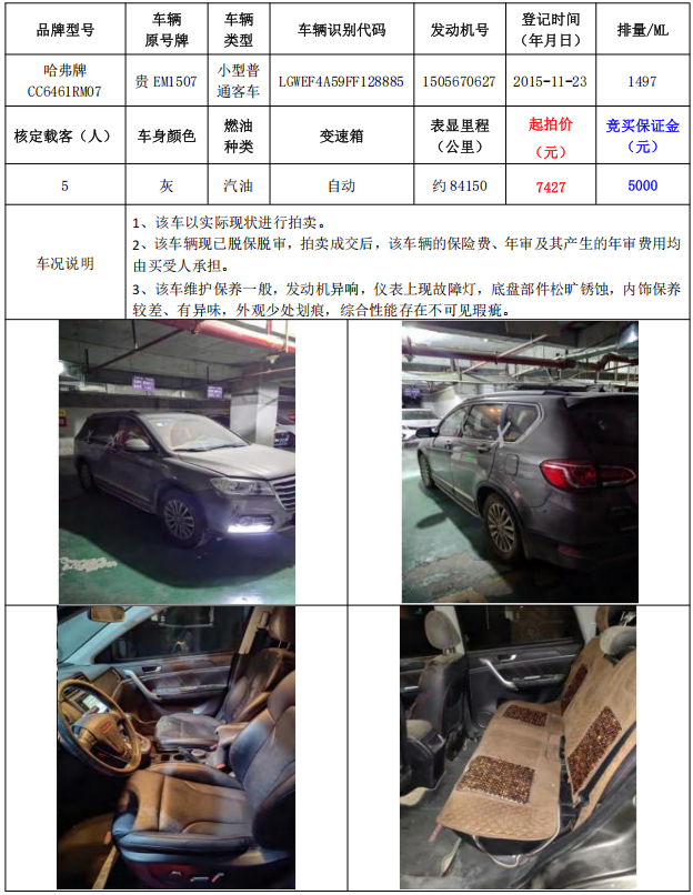 拍品編號(hào)6:哈弗牌CC6461RM07小型普通客車1輛(車輛原號(hào)牌:貴EM1507)