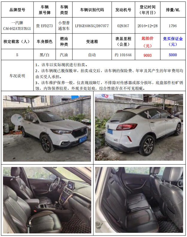 拍品編號(hào)3:一汽牌CA6462ATE5TKG1小型普通客車1輛(車輛原號(hào)牌:貴EFD273)