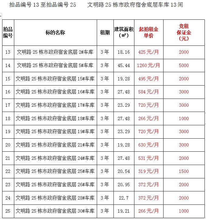 10、文明路25棟市政府宿舍底層車(chē)庫(kù)3年租賃權(quán)(面積約18.16㎡-45.44㎡)。