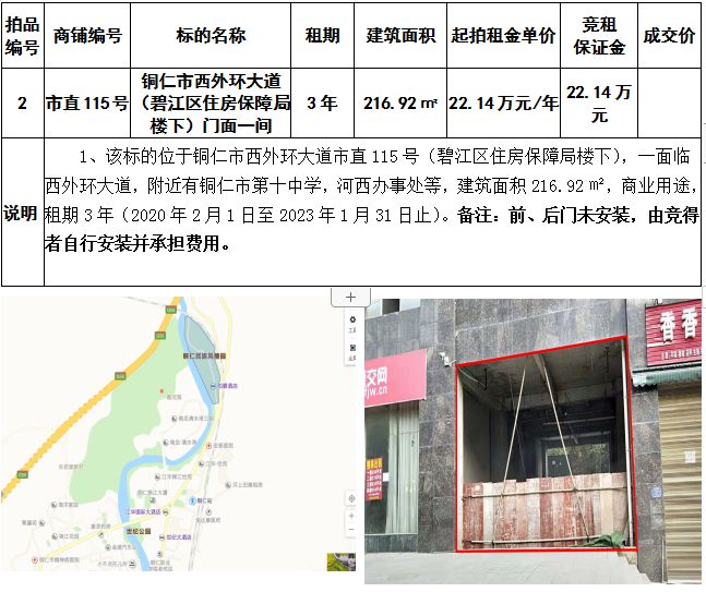 2、銅仁市西外環(huán)大道(碧江區(qū)住房保障局樓下)門面一間3年租賃權(quán)(建筑面積:216.92㎡);起拍租金單價(jià):22.14萬元/年;競租保證金:22.14萬元;