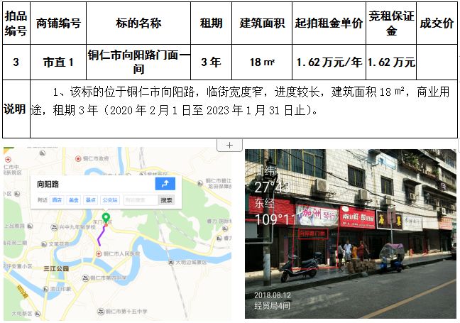 3、銅仁市向陽路門面一間3年租賃權(quán)(建筑面積:18㎡);起拍租金單價(jià):1.62萬元/年;競租保證金:1.62萬元。