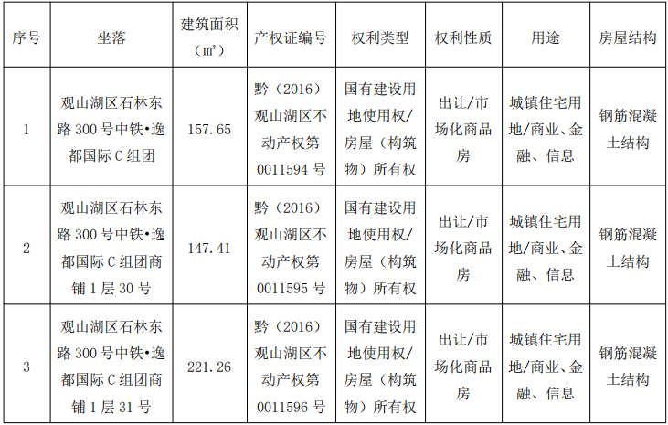 拍品編號1:貴陽市觀山湖區(qū)石林東路300號中鐵·逸都國際C組團(tuán)商鋪、1層30號商鋪、1層31號商鋪,共計(jì)3間,整體拍賣