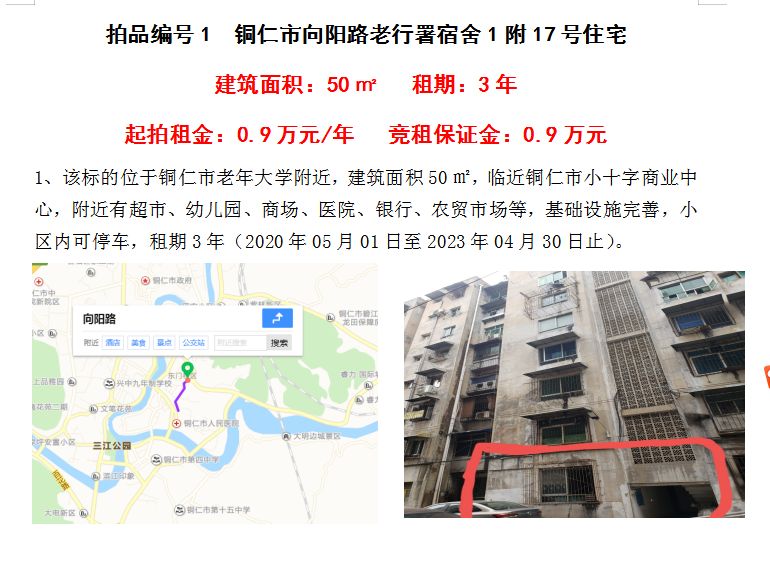 1、銅仁市向陽路老行署宿舍1附17號住宅3年租賃權(quán)(建筑面積:50㎡);起拍租金單價:0.90萬元/年;競租保證金:0.90萬元;