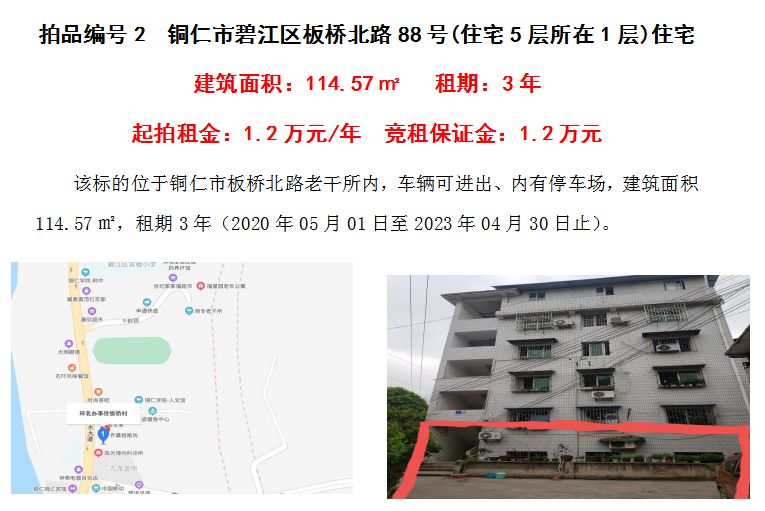 2、銅仁市碧江區(qū)板橋北路88號(住宅5層所在1層)住宅3年租賃權(quán)(建筑面積:114.57㎡);起拍租金單價:1.20萬元/年;競租保證金:1.20萬元;