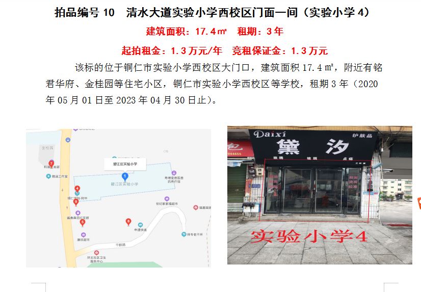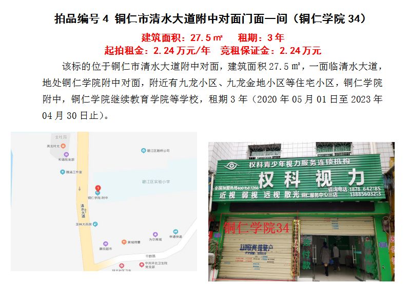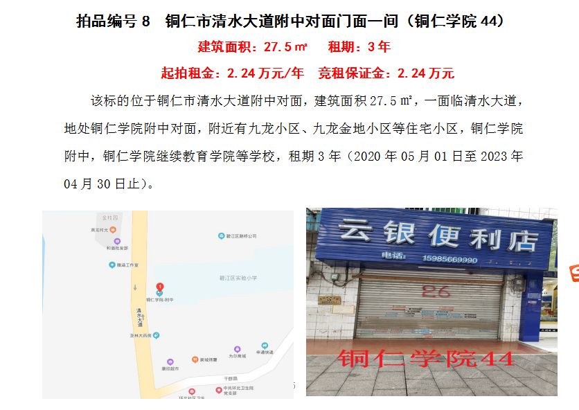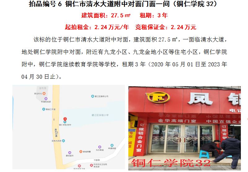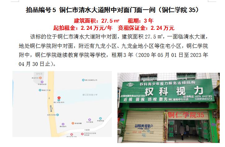 4、銅仁市清水大道附中對面門面五間3年租賃權(quán)(建筑面積:27.5㎡/間);起拍租金單價(每間):2.24萬元/年;競租保證金(每間):2.24萬元;