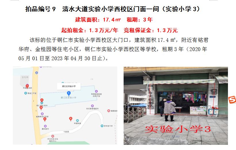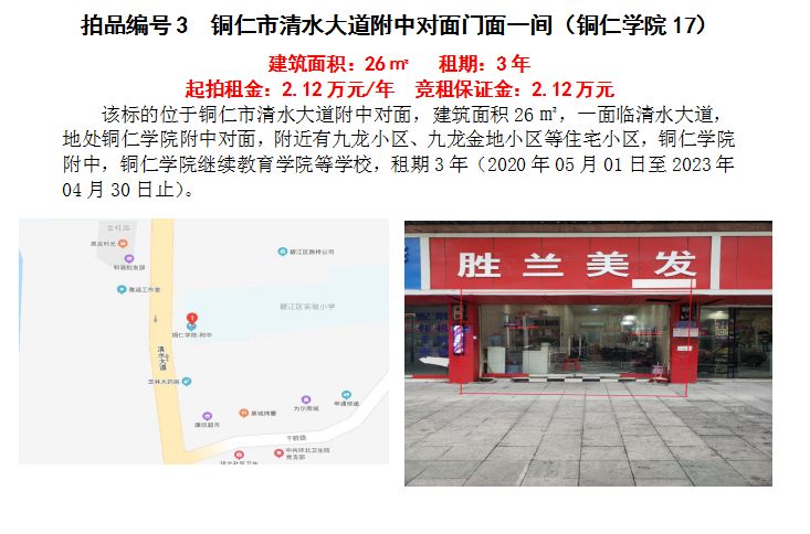 3、銅仁市清水大道附中對面門面一間3年租賃權(quán)(建筑面積:26㎡);起拍租金單價:2.12萬元/年;競租保證金:2.12萬元;