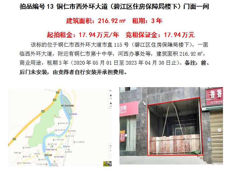 7、銅仁市西外環(huán)大道(碧江區(qū)住房保障局樓下)門面一間3年租賃權(quán)(建筑面積:216.92㎡);起拍租金單價:17.94萬元/年;競租保證金:17.94萬元;