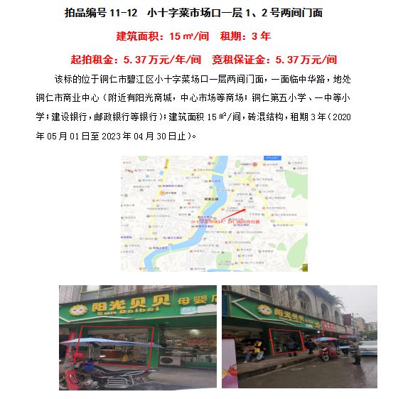 6、小十字菜市場口一層1-2號兩間門面3年租賃權(quán)(建筑面積15㎡/間);起拍租金單價(每間):5.37萬元/年;競租保證金(每間):5.37萬元;