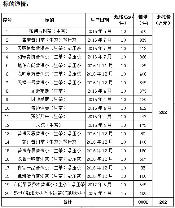 拍品編號(hào)1 布朗古樹茶(生茶)、國(guó)安普洱茶(生茶)緊壓茶、天賜易武普洱茶(生茶)緊壓茶、龍吟東方普洱茶(生茶)緊壓茶、龍?jiān)床祭剩ㄉ瑁┑?/span>20個(gè)品種共計(jì)8081件。