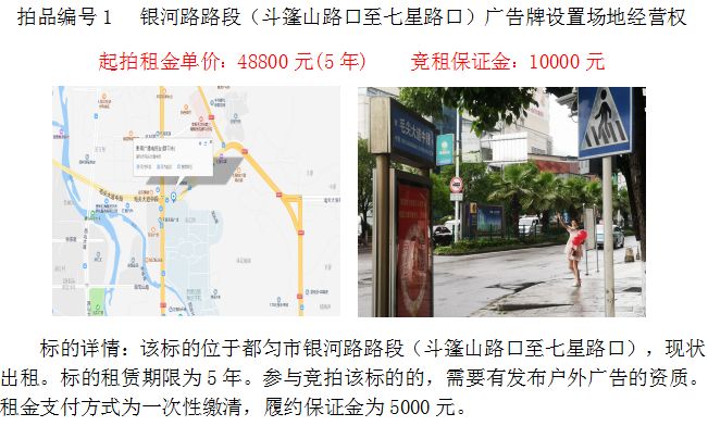 3、都勻市銀河路路段(斗篷山路口至七星路口)廣告牌設置場地經(jīng)營權(quán)5年租賃權(quán)。